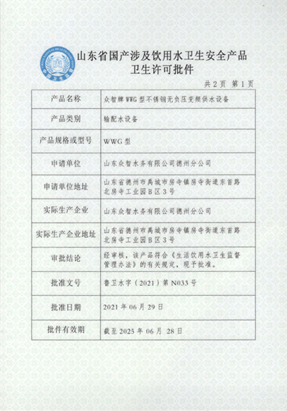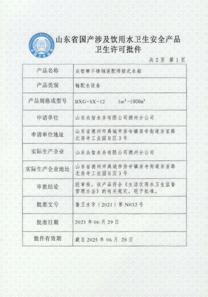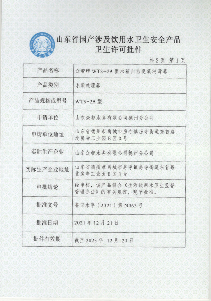 • 2025-07-16山東眾智水務有限公司成功申請山東省國產涉及飲用水衛生安全產品衛生許可批件